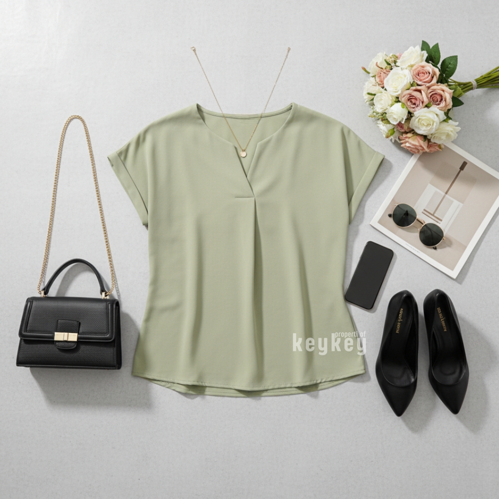 Blouse KYLA Army Elegance hadir dengan bahan Wolfis Premium yang jatuh, adem, dan tidak mudah kusut. Desain V-Neck split simple namun classy, potongan loose fit nyaman dipakai harian, cocok untuk kerja, kuliah, maupun hangout. Tersedia 18 warna dengan harga hemat Rp 36.900,-.