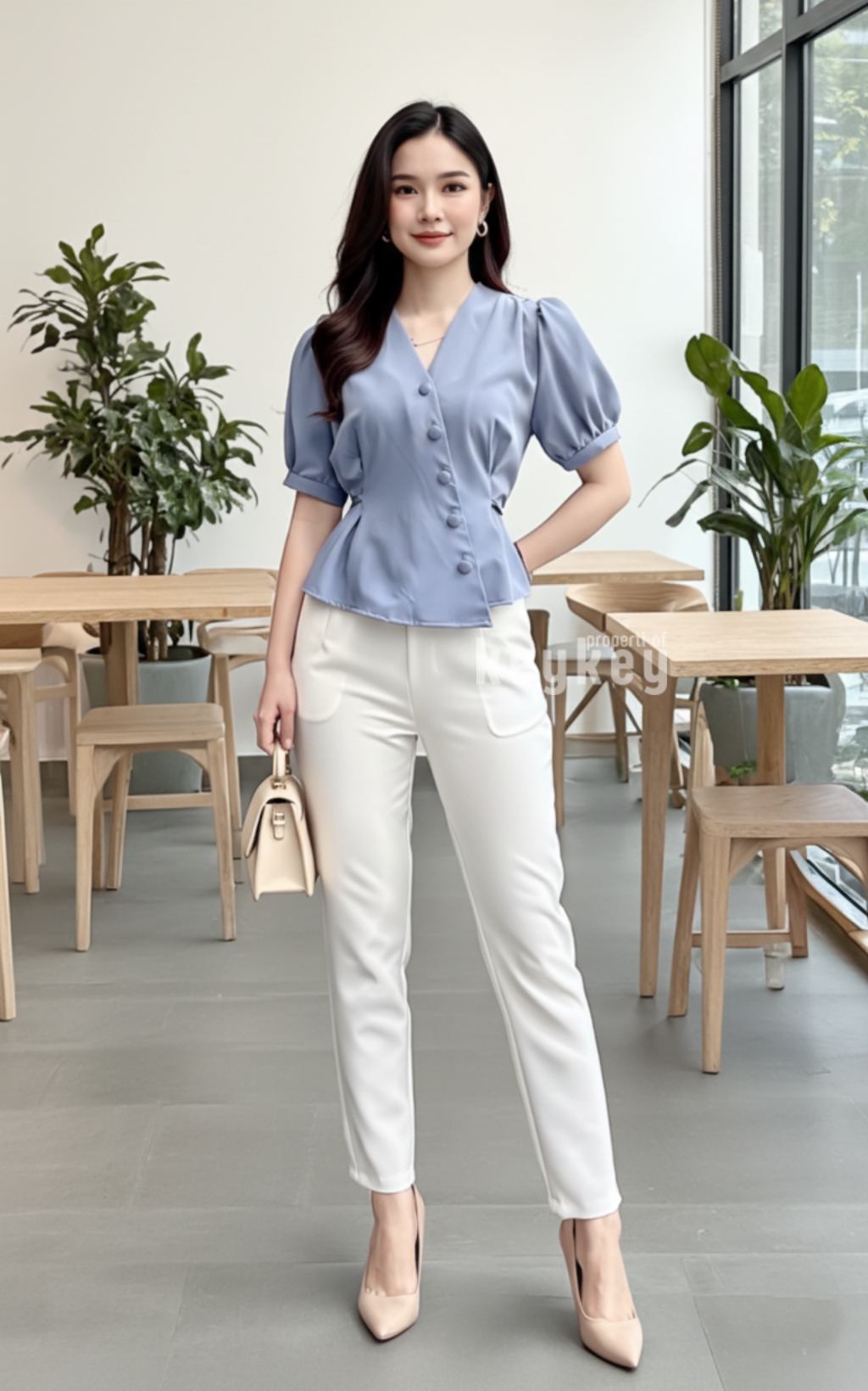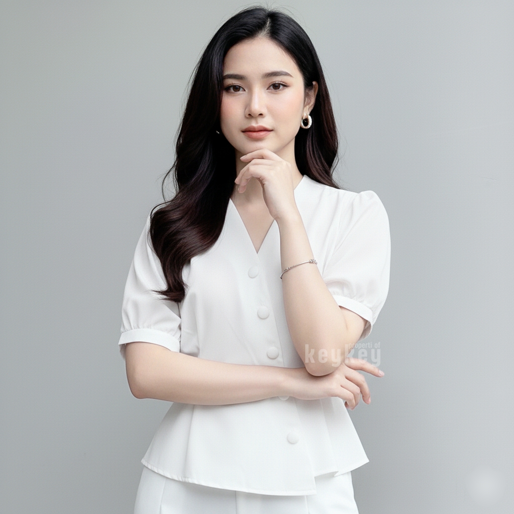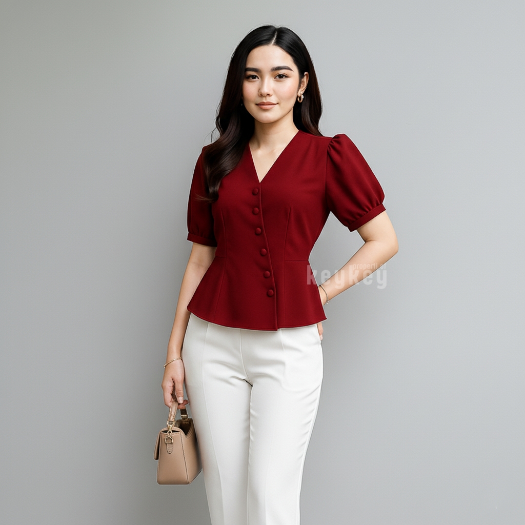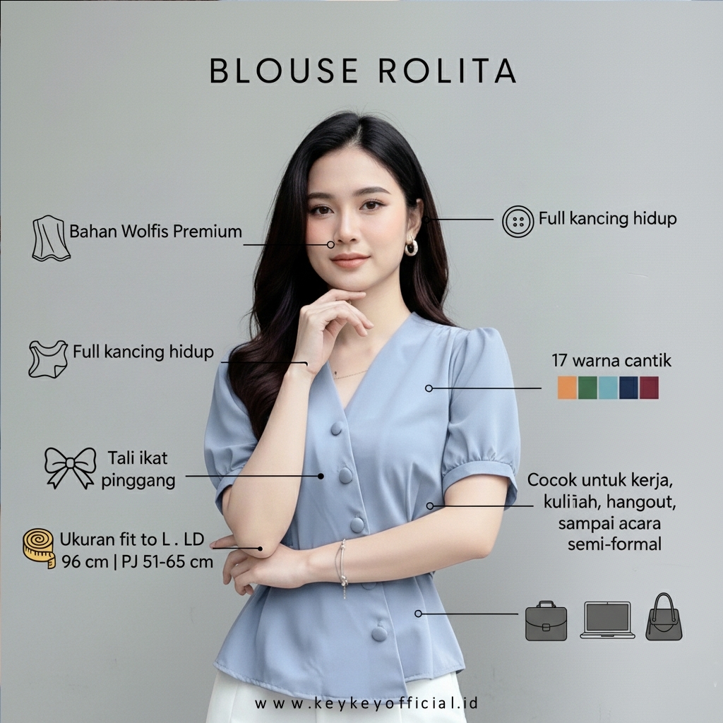 Terbuat dari bahan wolfis premium, blouse ini memiliki tekstur halus, adem, dan nyaman dipakai seharian, baik untuk ke kantor, kuliah, maupun hangout santai. Dilengkapi full kancing kain senada yang memberikan kesan rapi, serta tali ikat belakang yang bisa disesuaikan agar lebih fit mengikuti bentuk tubuhmu.