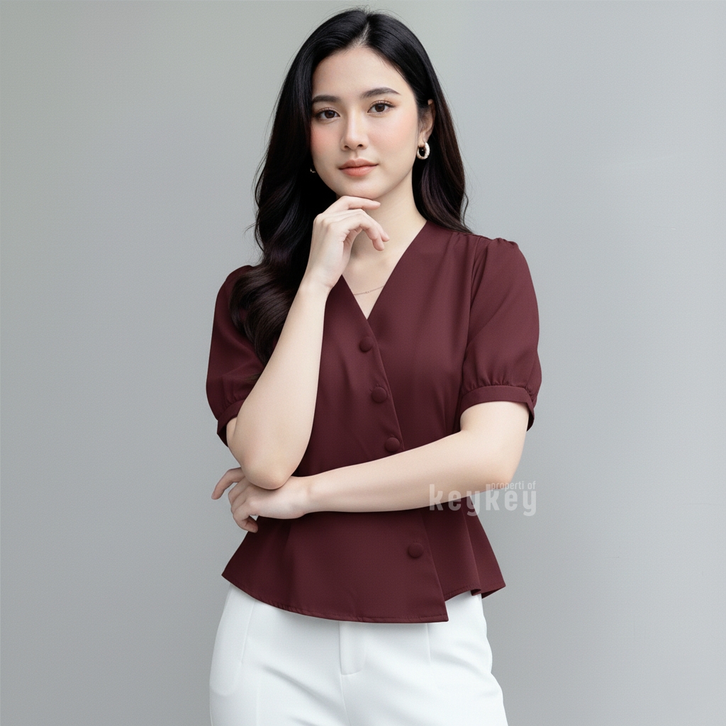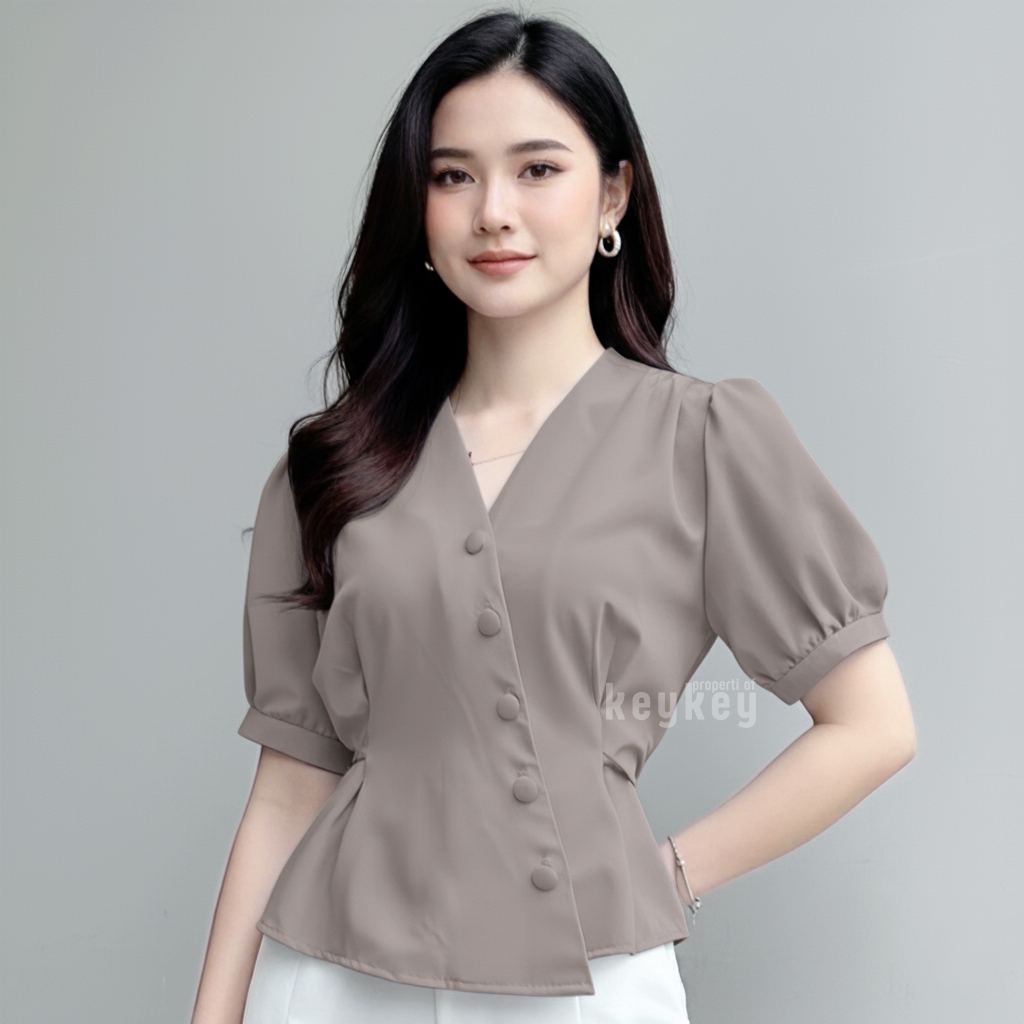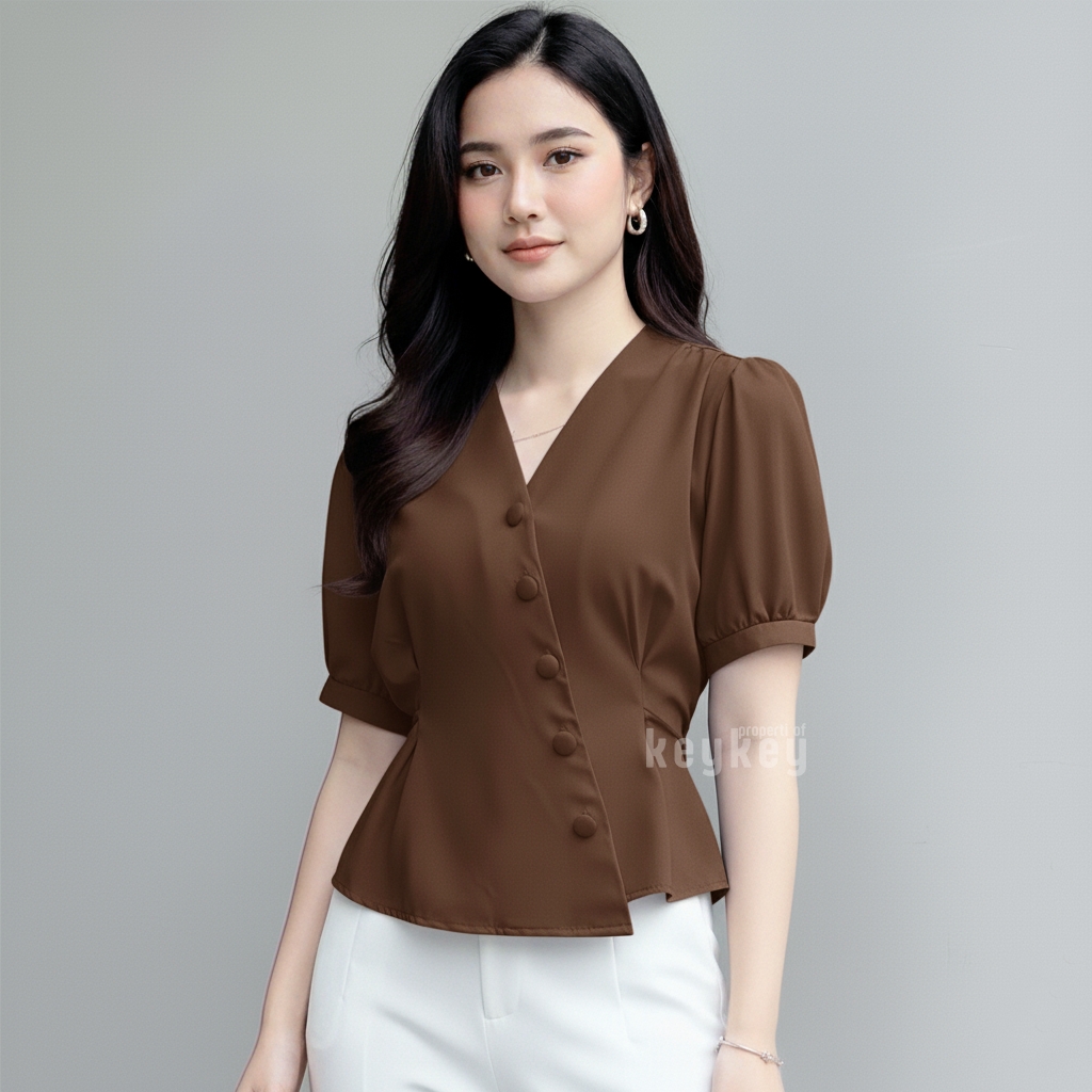 Blouse ROLITA Brown, bahan wolfis premium, desain asimetris modern dengan tali belakang & kancing senada. Elegan, nyaman, harga terjangkau.