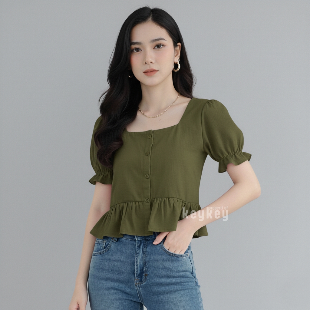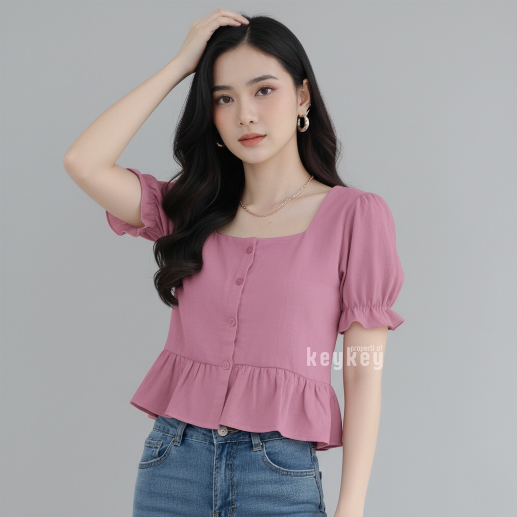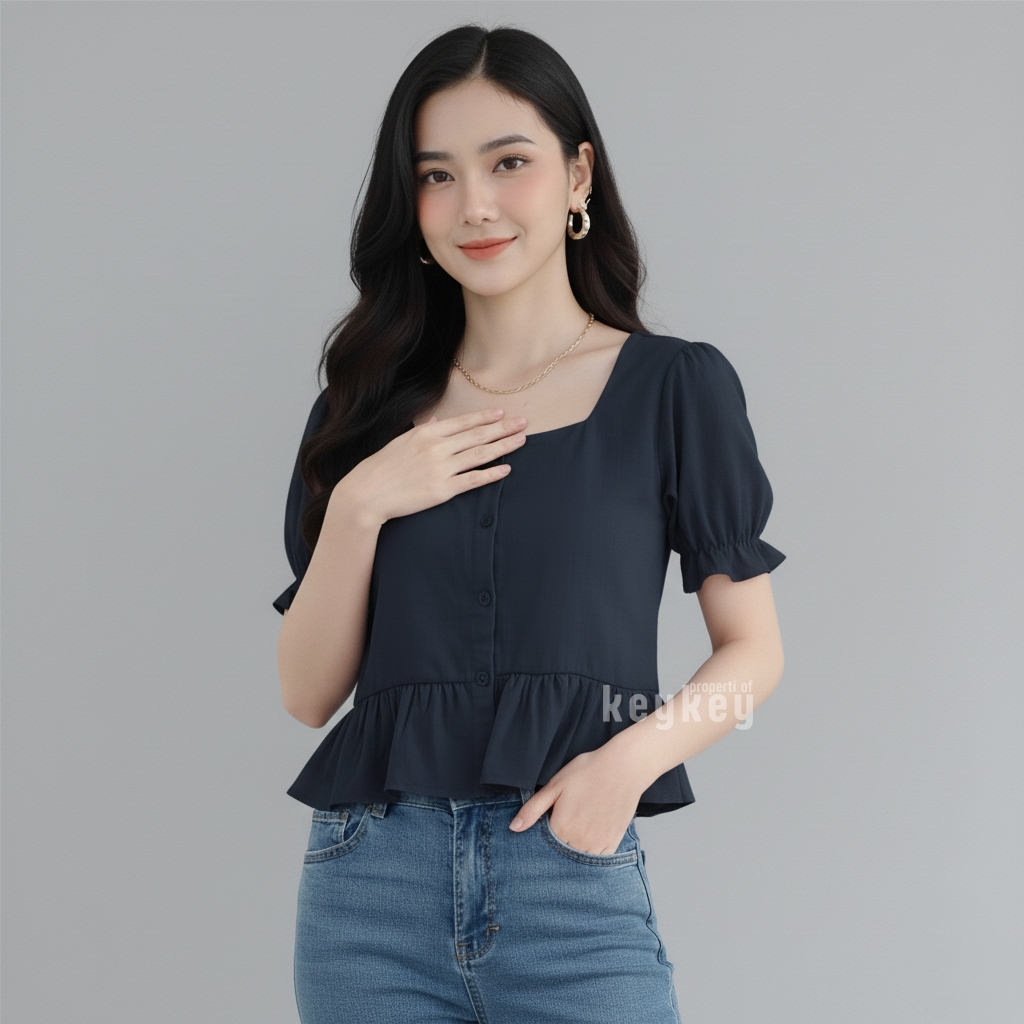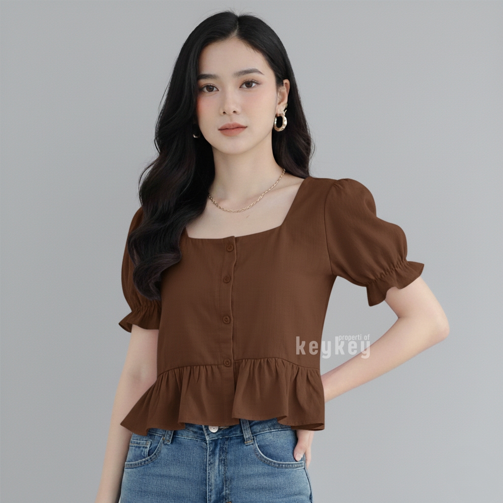 Blouse Candy Black dengan bahan wolfis premium, square neckline elegan, peplum ruffle manis & lengan puff cantik. Nyaman dipakai sehari-hari hanya Rp 36.900,-