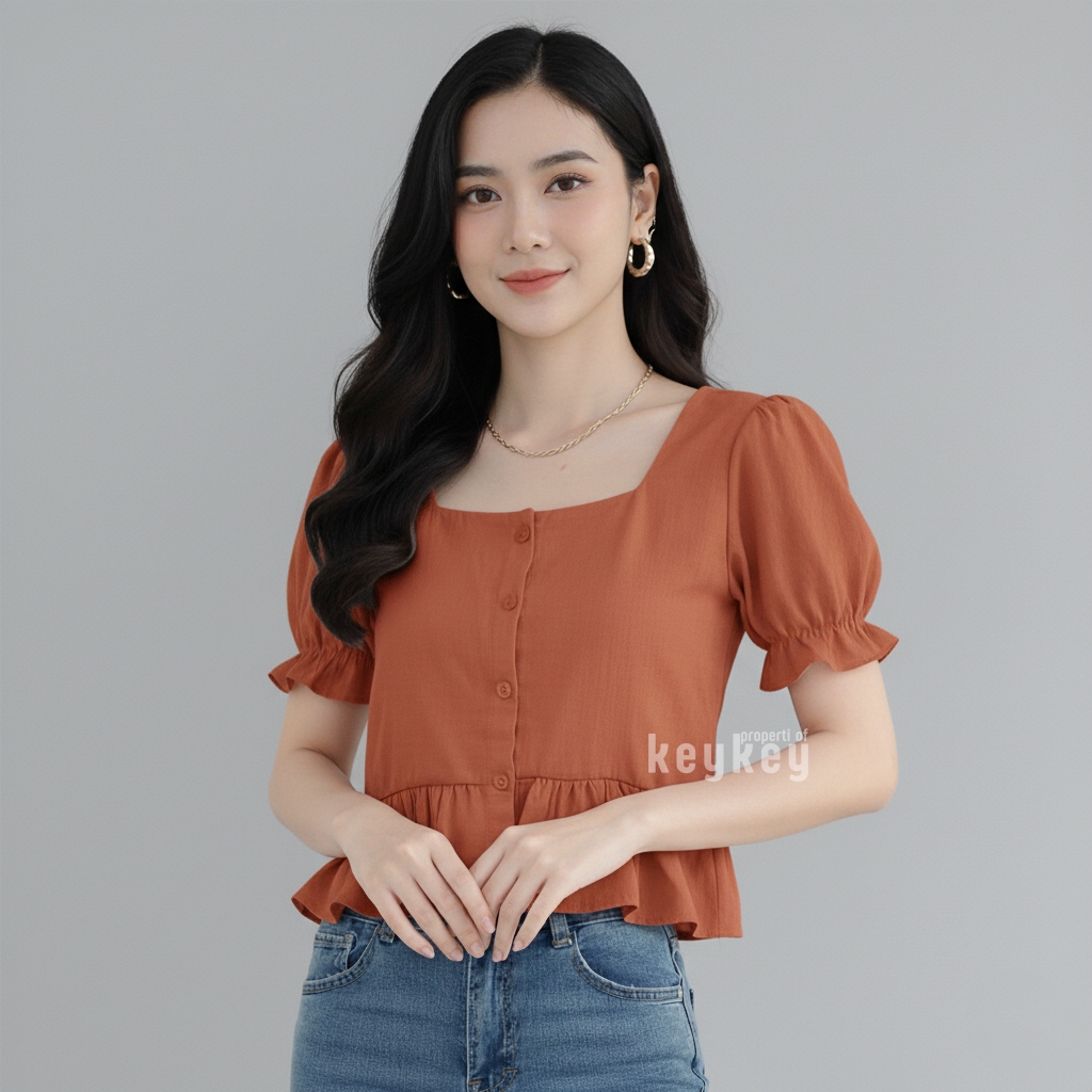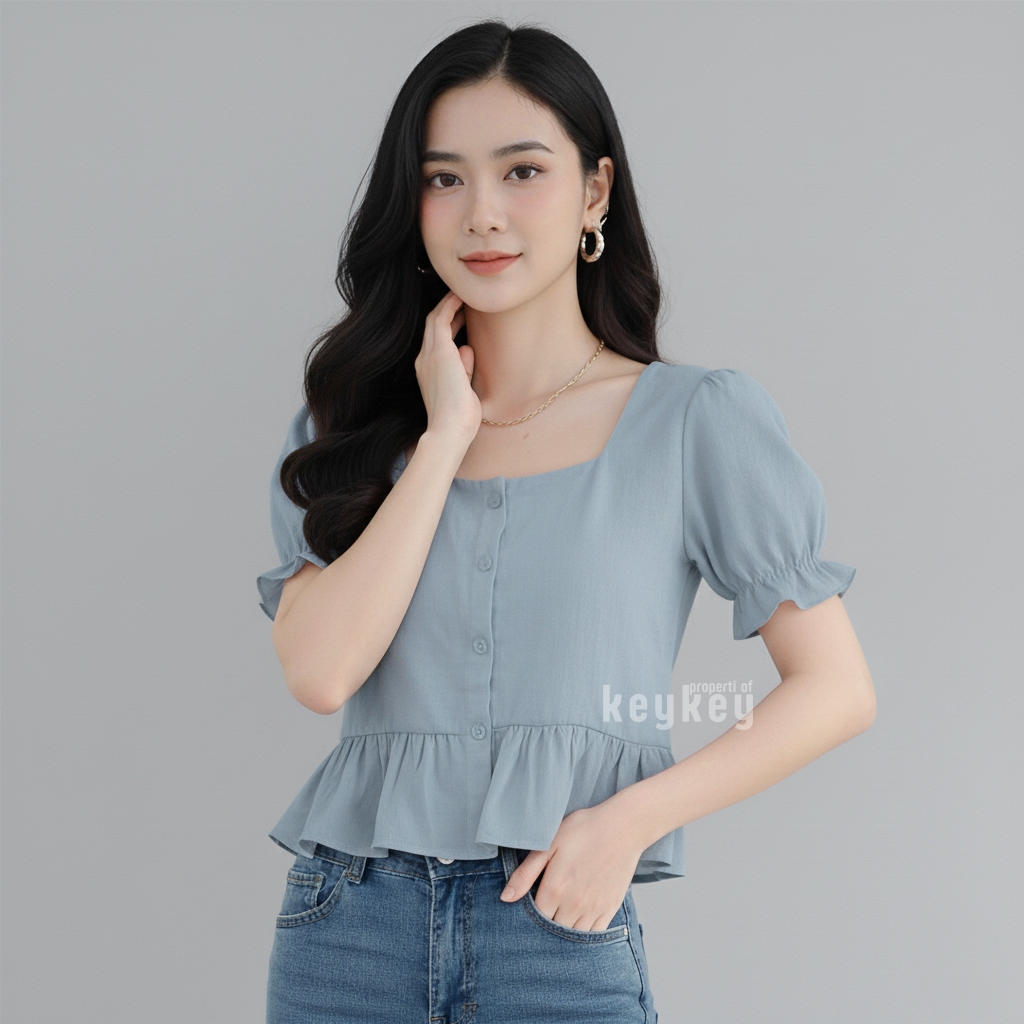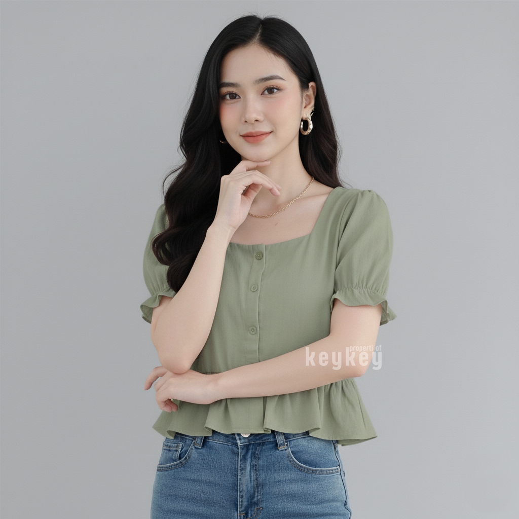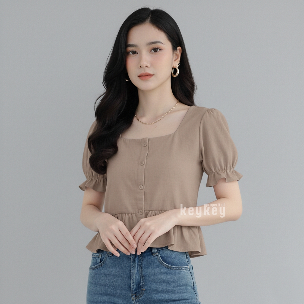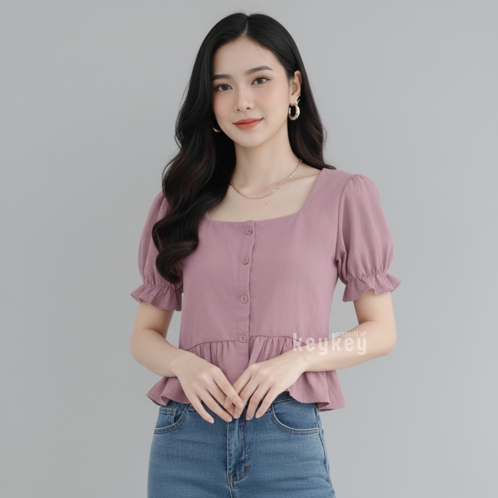 Blouse Candy Black dengan bahan wolfis premium, square neckline elegan, peplum ruffle manis & lengan puff cantik. Nyaman dipakai sehari-hari hanya Rp 36.900,-