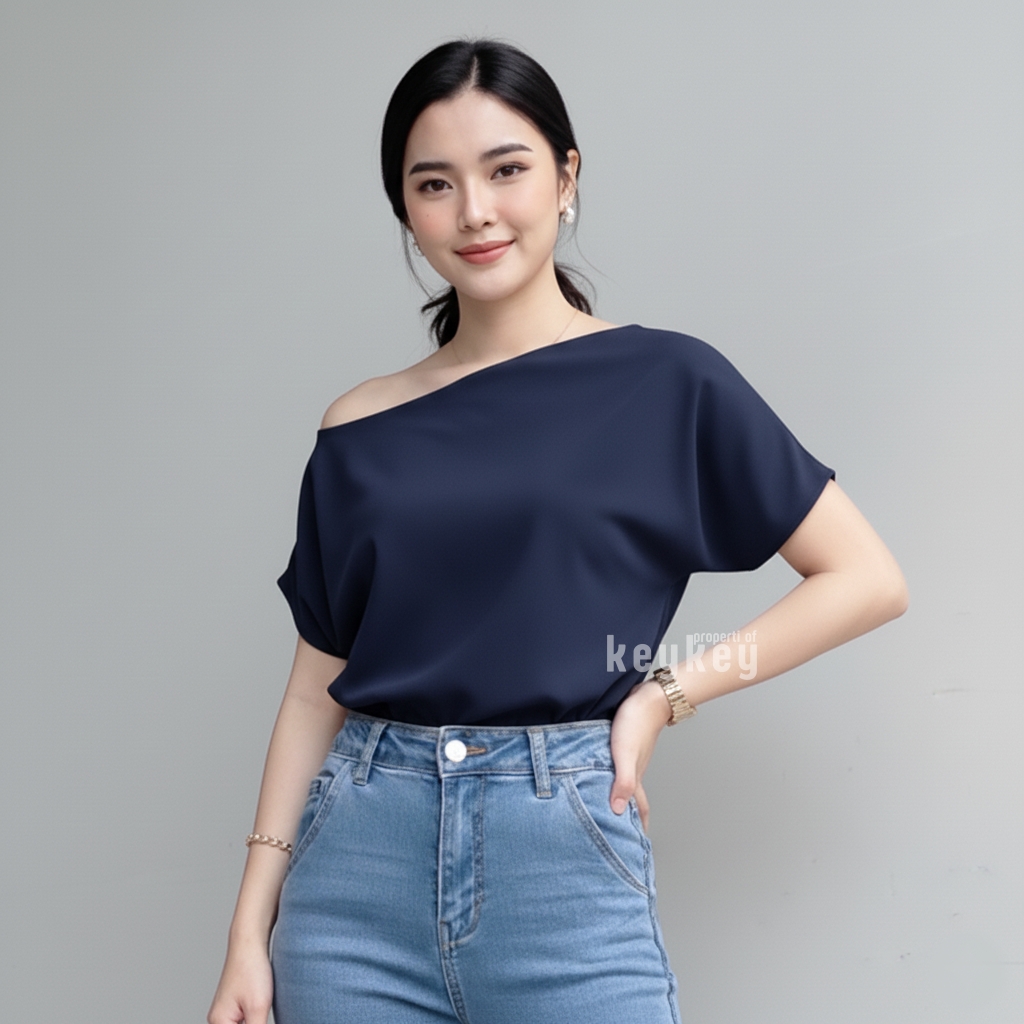 BLOUSE KINO Navy β blouse one-shoulder berbahan moscrepe premium, simple elegan, fit to L, nyaman dipakai & mudah dipadukan. Harga hemat Rp 29.900,-.