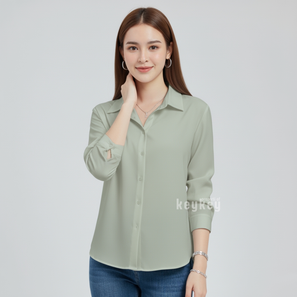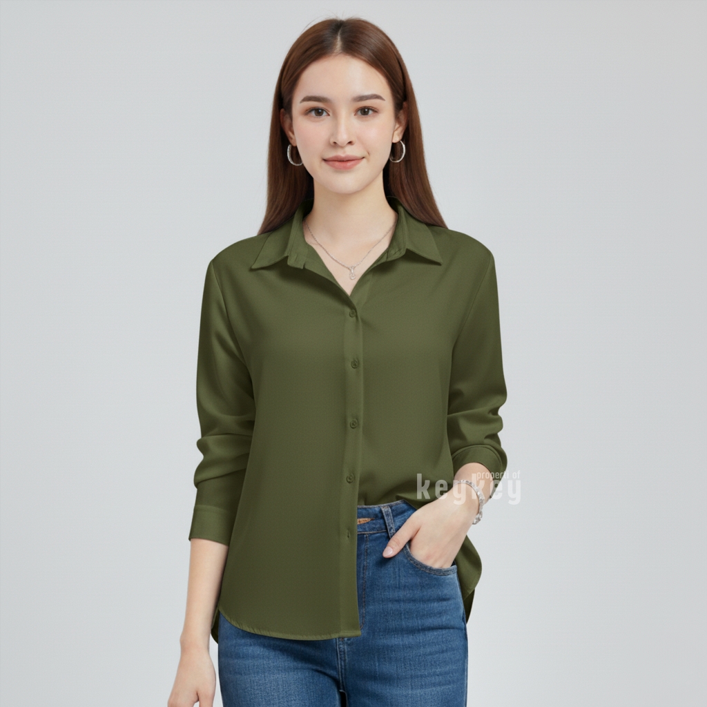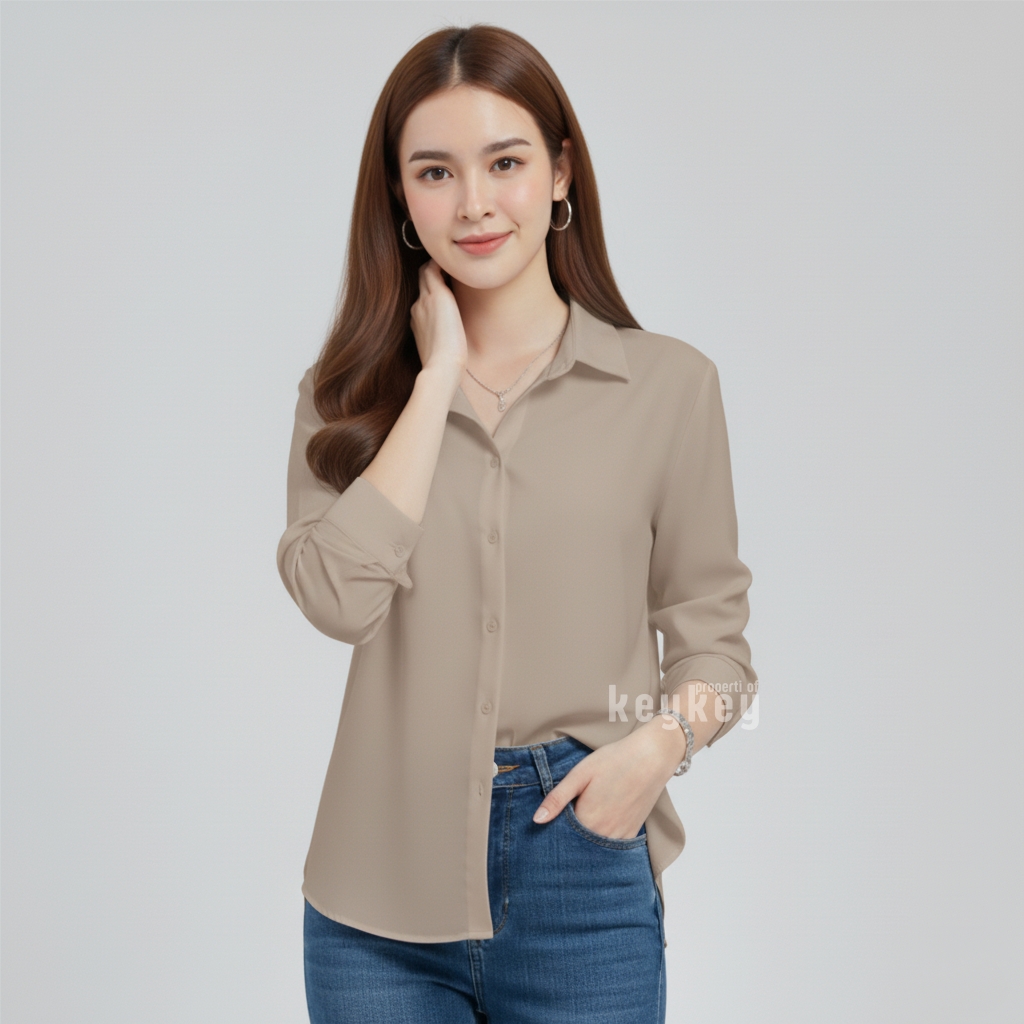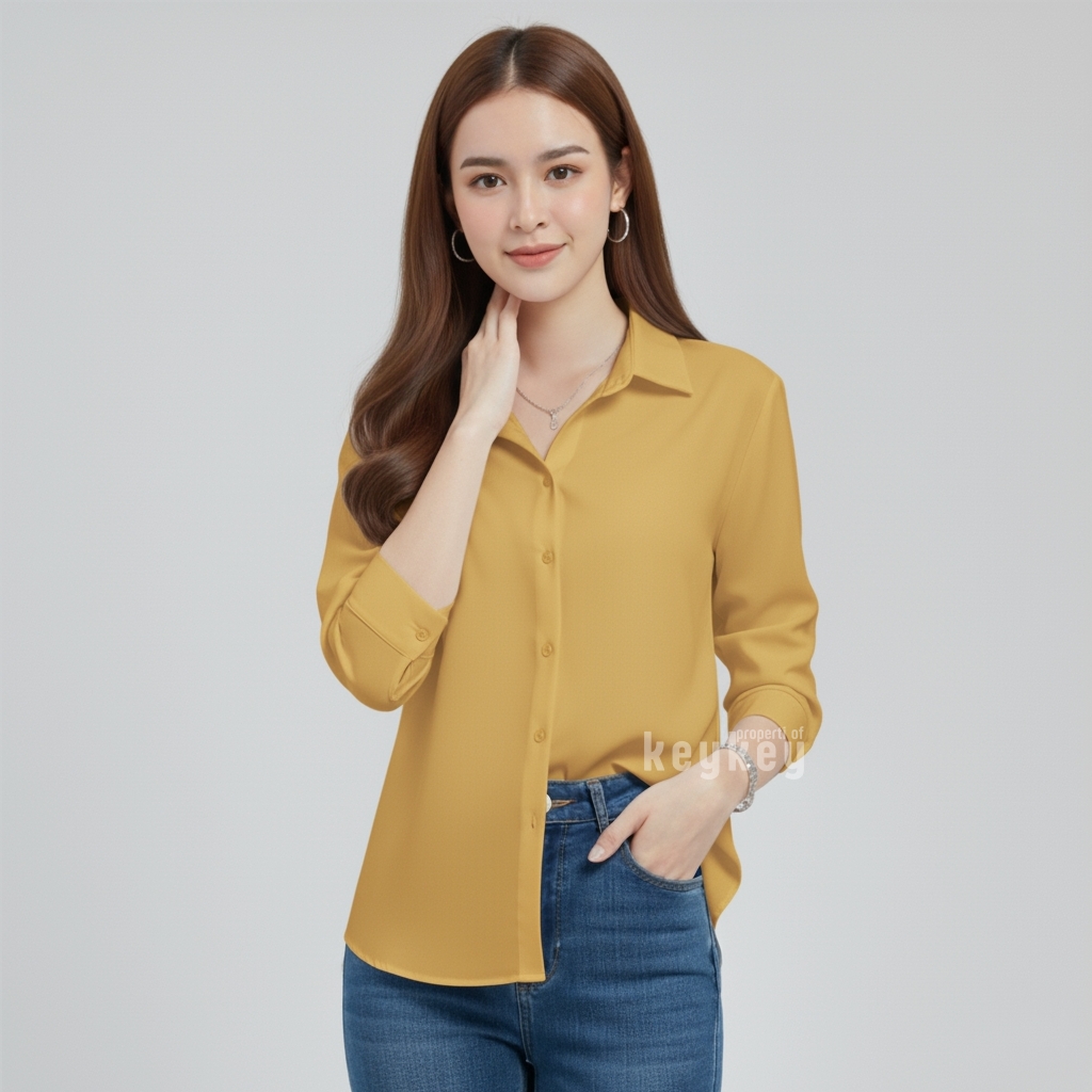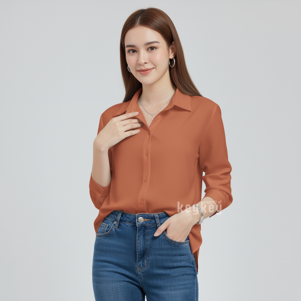 Modelnya simpel dengan potongan loose fit, membuat tubuh tetap leluasa bergerak tanpa kehilangan kesan stylish. Lengan panjang dengan detail kancing menambah sentuhan formal namun tetap bisa dipakai santai. Bisa kamu padukan dengan jeans untuk gaya casual, atau celana bahan untuk tampilan profesional saat kerja maupun meeting.